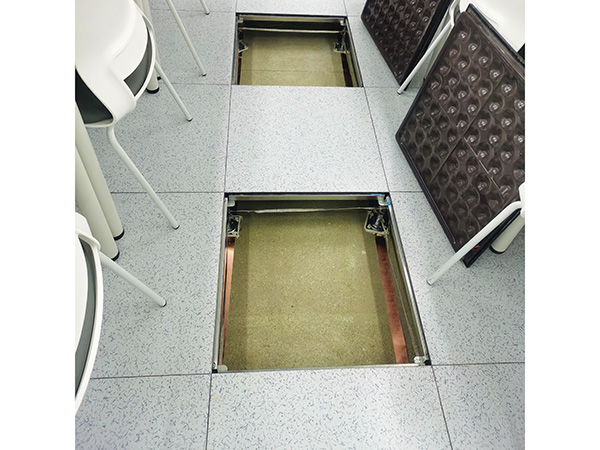 地板表面采用专业防静电瓷砖面层,瓷砖掺加导电粉烧制而成,永久耐磨,瓷砖常用为小蓝花纹和小黄花纹色,四周胶条封边;